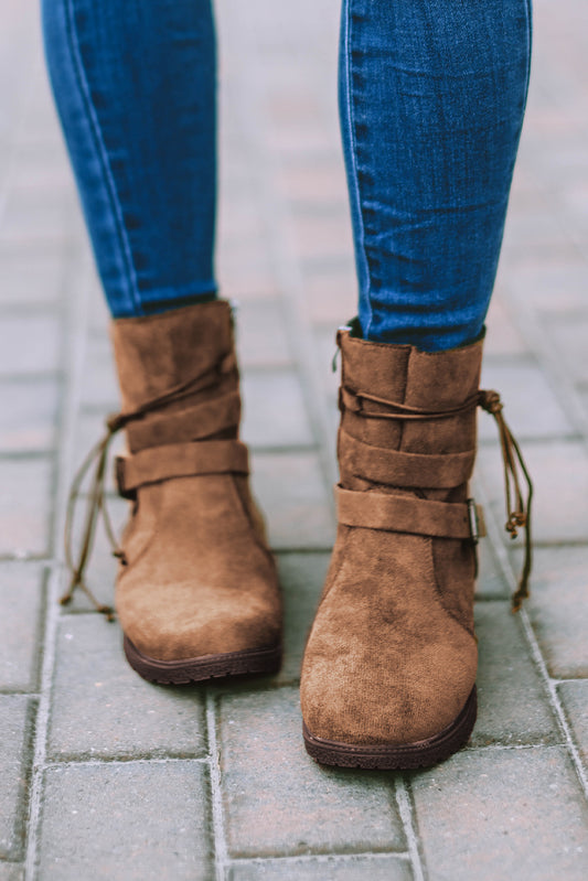Brown Faux Suede Zip Up Buckle Straps Ankle Boots
